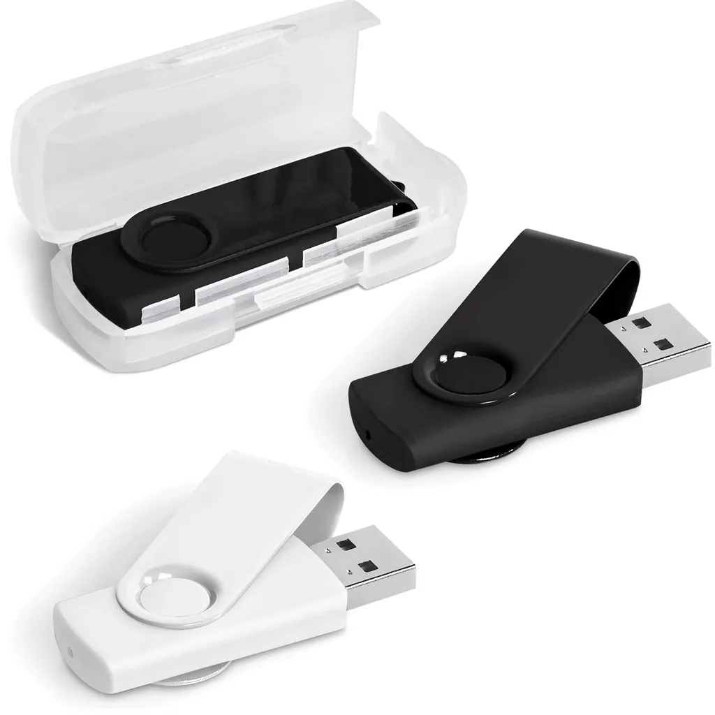 Classic flash drive with a metal swivel and a soft touch lacquered base. It has 16GB of memory, with a USB 2.0 interface. Presented in a transparent case.