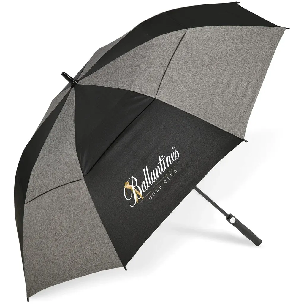 A sporty yet elegant windproof umbrella with alternating black and grey panels. Includes a black umbrella pouch with a carry strap.